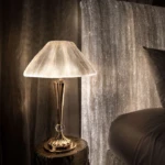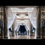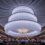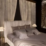 Pueden ser simples paneles rectos o con ondas de luz que dan una sensación de movimiento. La cenefa técnica, en raso de algodón, oculta el sistema eléctrico y se conecta fácilmente a una toma de corriente en el techo o pared.